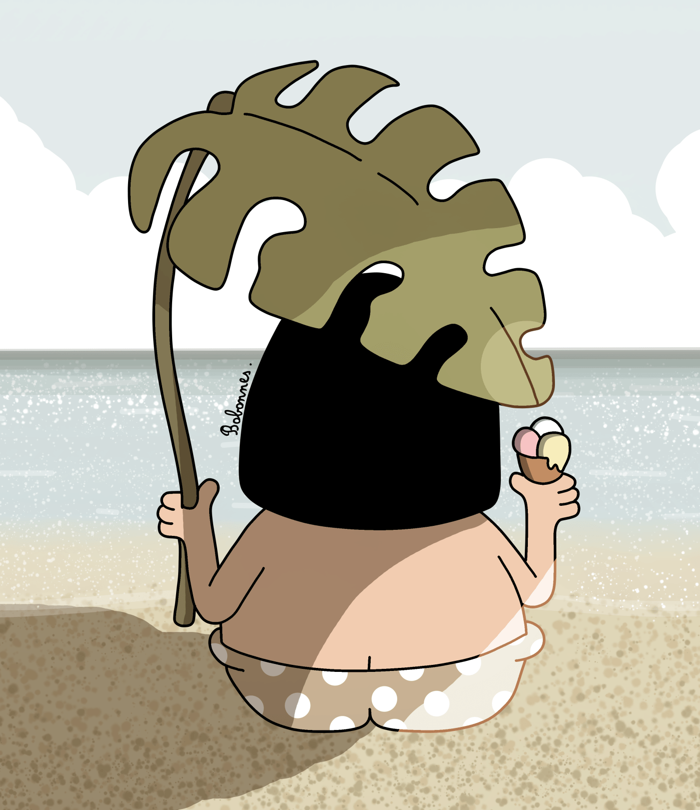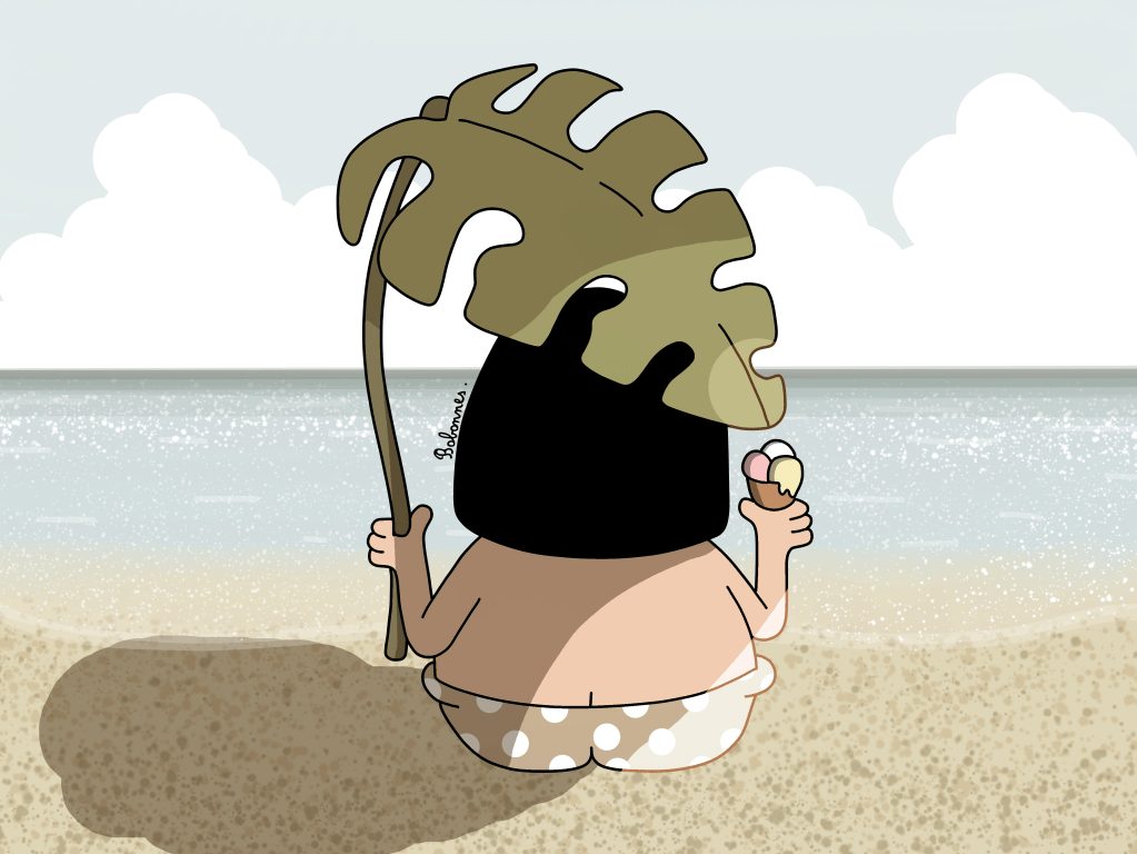 Aujourd’hui je me suis amusée à faire un dessin de plage, avec ma grosse feuille et ma glace 🙂