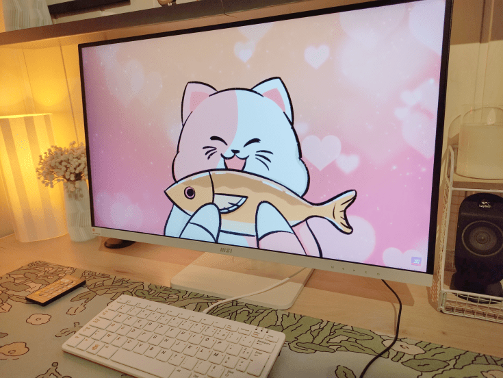 Il s’agit d’un moniteur MSI Modern MD271QPW, il fait 27 pouces et a une résolution de 2560X1440. L’esthétisme d’un écran compte énormément pour moi, peut être même plus que ses capacités, celui ci réunit les deux. Il possède un pied ergonomique, ultra pratique pour y ranger le clavier et ainsi libérer l’espace sur le bureau pour faire de gros dessins ou manger de grosse tartines ^^
